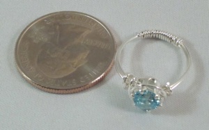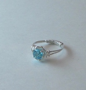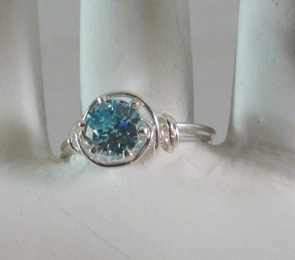 This is a sterling silver ring with a wrapped 6mm aquamarine cubic zirconium. The shank is wrapped for extra wearing comfort and stability.