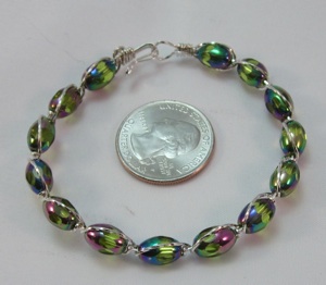 This bracelet is made with sterling silver wire wrapped around glass iridescent beads. They sparkle and look beautiful as they catch the light.