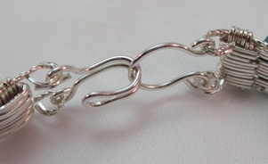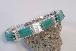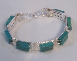 This bracelet is made with sterling silver wire and rectangular beads. It is a rigid bangle formed in an oval like the shape of the wrist so it is very comfortable to wear.