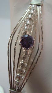 This bracelet is made with sterling silver wire with a sapphire cubic zirconium stone set in the center surrounded by sterling beads.