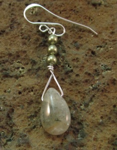 These dangle earring are made with sterling sliver wire, 3 pearl green beads and a briolette bead.