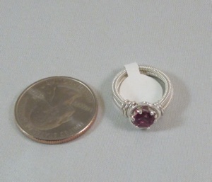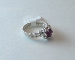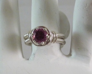 This ring is made with sterling silver and wrapped with an alexandrite cubic zirconium crystal. Each shank wire is completely wrapped with wire which makes an incredibly comfortable ring.