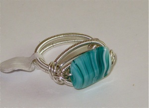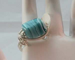 It is embellished with variegated aqua colored bead. This makes an incredibly comfortable ring.