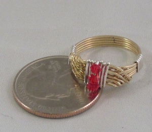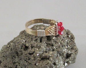 This crystal wave ring is made from gold filled wire, but it is wrapped in sterling silver for that two toned look. It is embellished with 3 red bicone swarovski crystals.