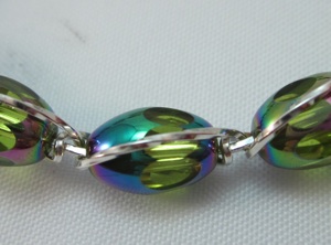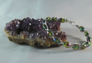 This bracelet is made with sterling silver wire wrapped around glass iridescent beads. They sparkle and look beautiful as they catch the light.