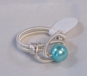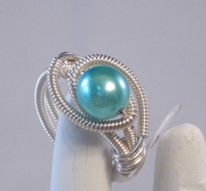 This ring is made with sterling silver wire that is completely wrapped in sterling wire for added interest. It is embellished with a beautiful soft aqua colored pearl. This is an incredibly comfortable ring.