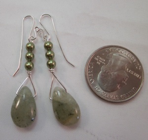 These dangle earring are made with sterling sliver wire, 3 pearl green beads and a briolette bead.